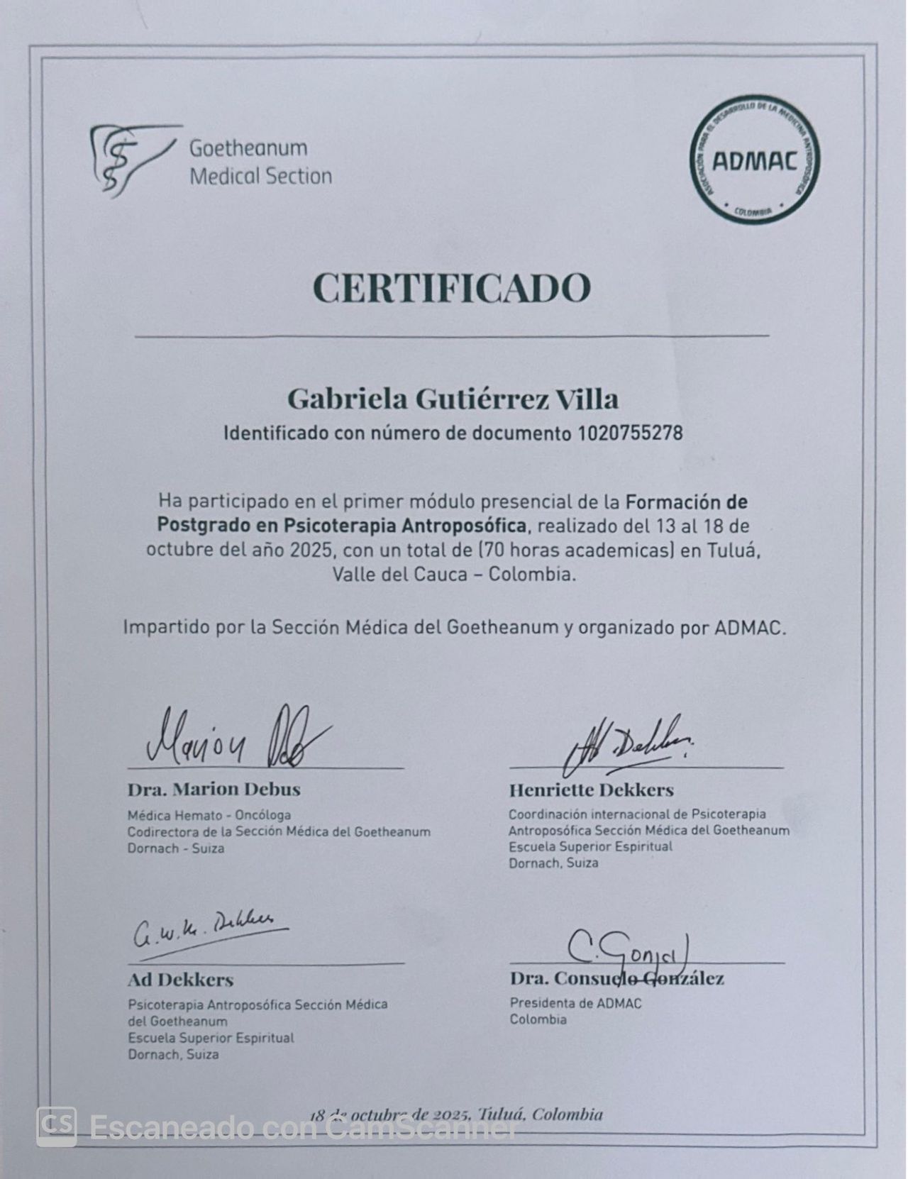 - Maestria en Psicoterapia Antroposófica, ADMAC, ( 2025-2029)