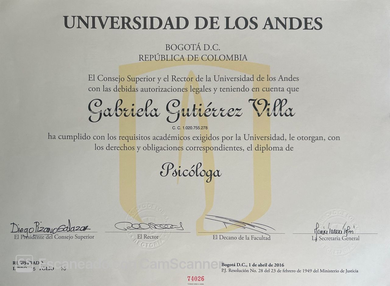 - Psicóloga, Universidad de los Andes, (Bogotá 2015)